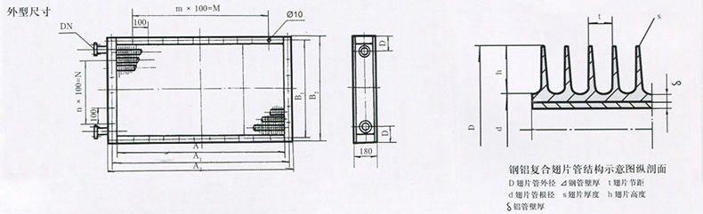 | 外徑D(mm) | 翅片高度h(mm) | 翅片厚度s(mm) | 翅片節距t(mm) | 鋁管壁厚h(mm) | 鋼管壁厚h(mm) | 總外表面積Sw(m2/m) |